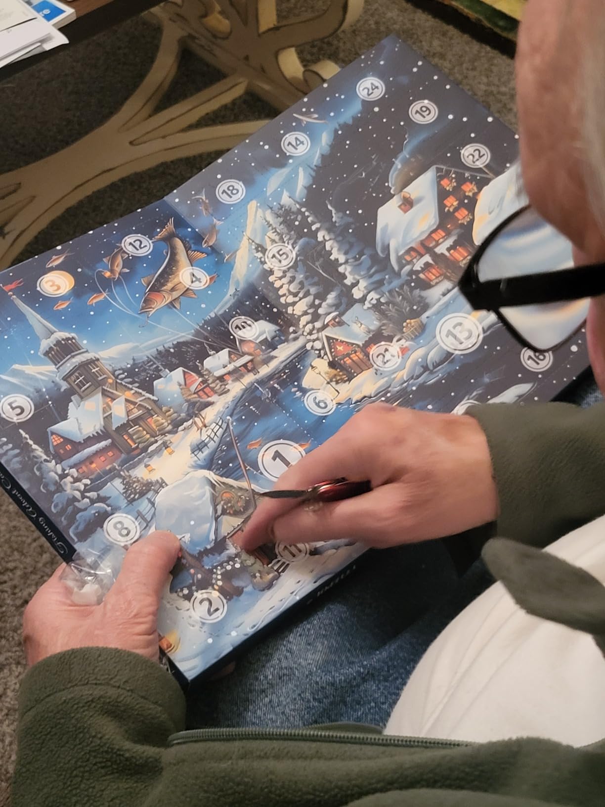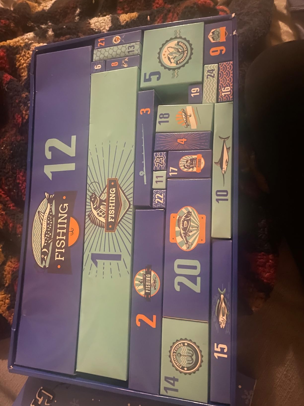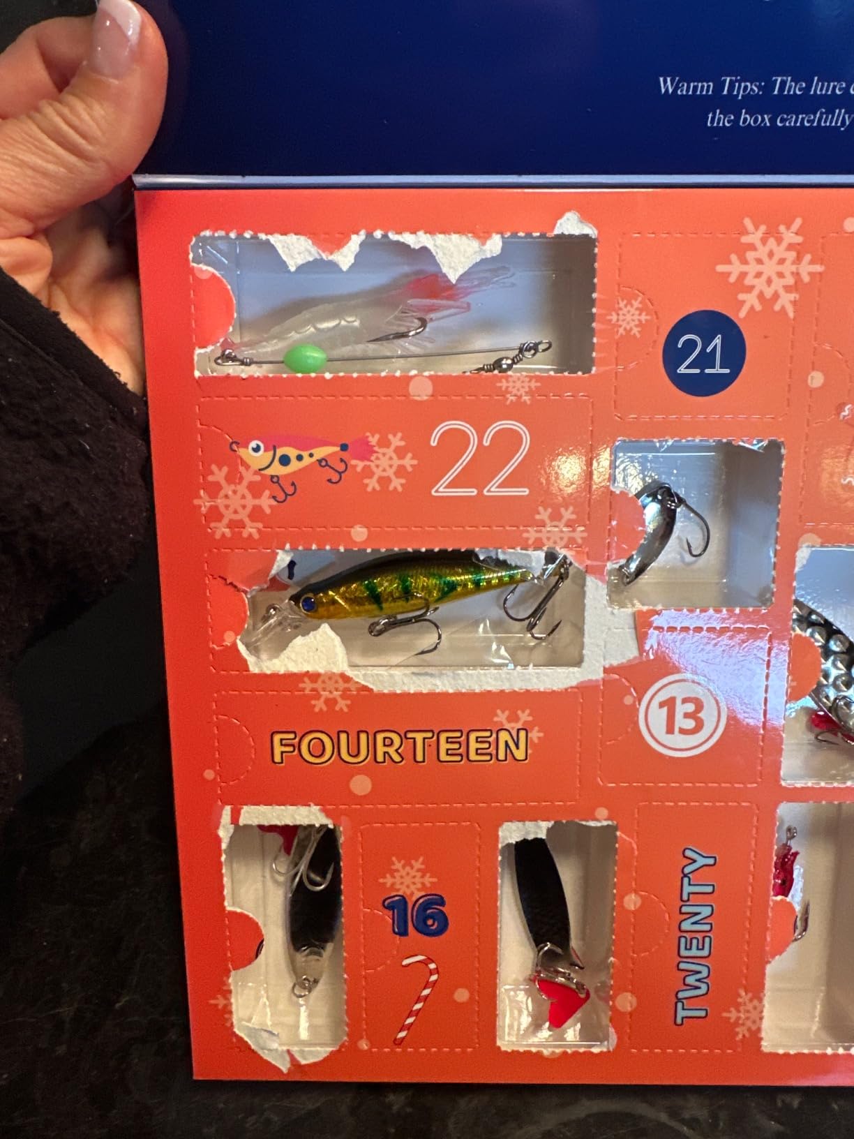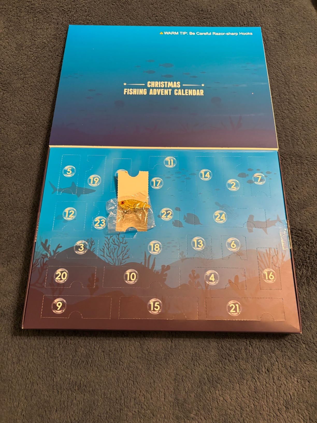 Each calendar has 24 numbered doors. Starting from December 1st, you open one door each day to reveal a fishing gift. The final and largest surprise comes on December 24th!